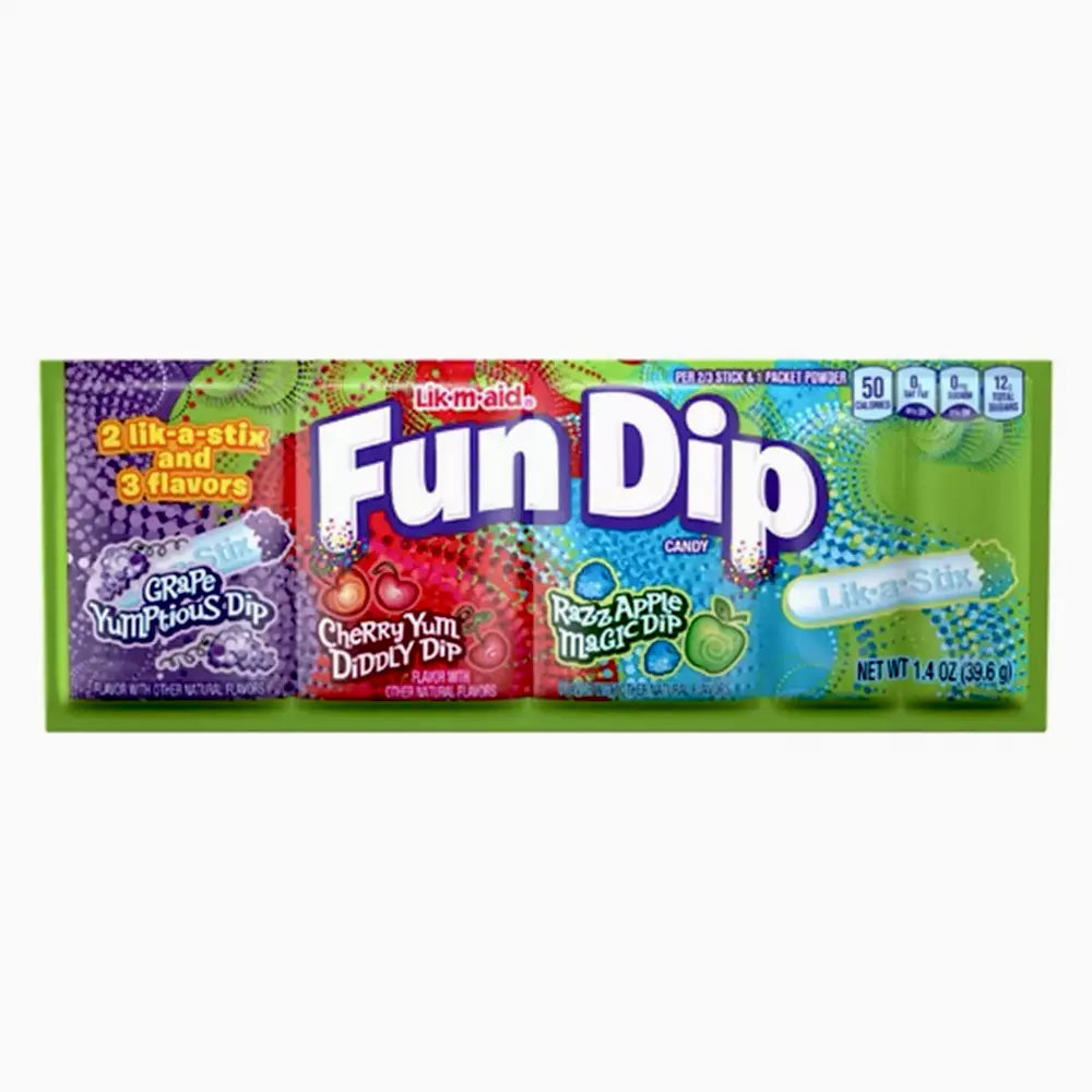 Lik-M-Aid Fun Dip, 2 Lik-a-stix and 3 flavours. Razz Apple Magic Dip, Cherry Yum Diddly Dip and Grape Yumptious Dip.